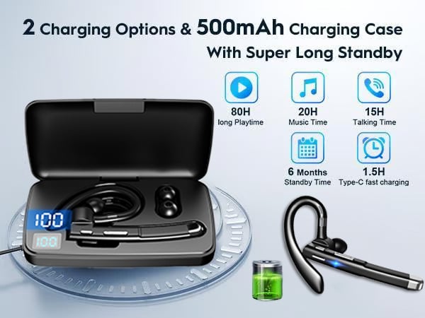 [Large Capacity Battery Support] Equipped with a 500mAh charging case, the YYK520 ensures nearly 80 hours of music/call time for your Bluetooth earpiece. The single headset offers 15-20 hours of usage time, providing flexibility for extended use. Choose between two charging methods to address any battery concerns
